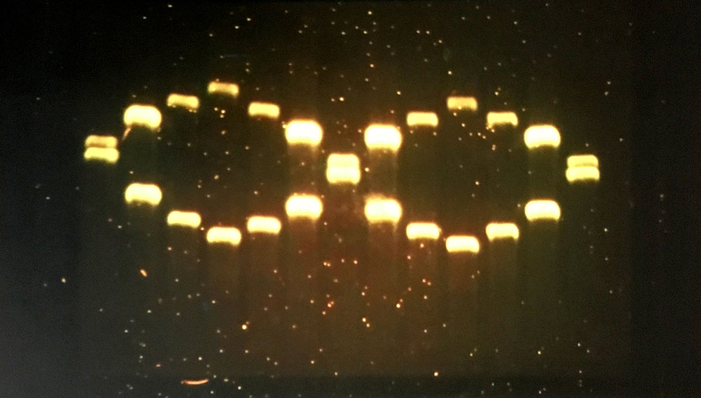 Gallery, Philadelphia, on October 20, 2016, and received an Award of Distinction at Prix Ars Electronica, Linz, in 2017. Visitors to the installation first encountered what might resemble a human-scale fountain or decanter, which was actually a spittoon in which their donated spit was collected. Entering the exhibition, viewers were offered a one ounce cup of saline solution and asked to swish for thirty seconds, then to deposit the solution into the spittoon. During the installation I extracted the DNA from what I hoped to be hundreds of spit samples—containing cheek cells and the cells’ DNA—all mixed together. The DNA was not individuated nor retained: it was processed as a whole to make iconic DNA Fingerprint images of power—such as a crown, warplanes and a flag—which were visible as video projections of the electrophoresis gels throughout the exhibition. |