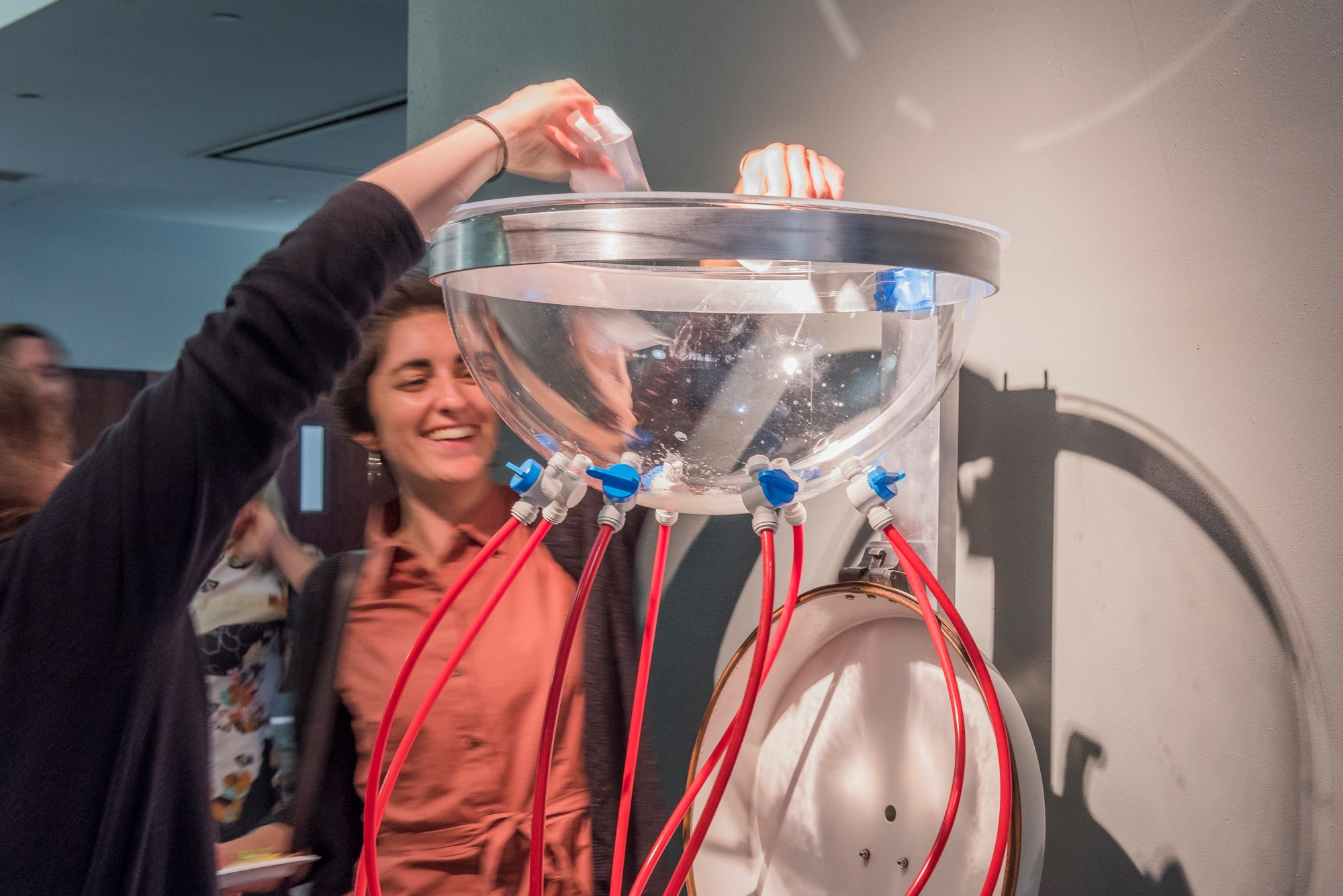 of this exchange gives the “master” an upper-hand on civilization. —Andres Tapia-Urzua, Pittsburgh, PA Savvy personal genome companies, like 23andMe, have managed to convince over two million people to not only donate their individual DNA samples to be utilized as the company sees fit, but to actually pay the company for the service. Conversely, The America Project does not want to normalize nor acclimatize viewers to surrendering their fluids for fun, safety or profit. Hopefully, the enormous spittoon doesn’t elicit blind trust. It is a symmetrical, somewhat anthropomorphic, authoritarian-looking apparatus standing six feet tall. Ironically, the spittoon was designed to serve as a utopian and unambiguous bio-matter anonymizer. Everyone’s spit is mixed together making separation/individuation impossible. All collected samples merge to become promiscuously comingled. What is visualized from the comingled samples is our shared identity as mammals, our collectivity. opposite: America Project , Gallery visitors donating DNA, Esther Klein Gallery, Philadelphia, PA, photo Jaime Alvarez. |