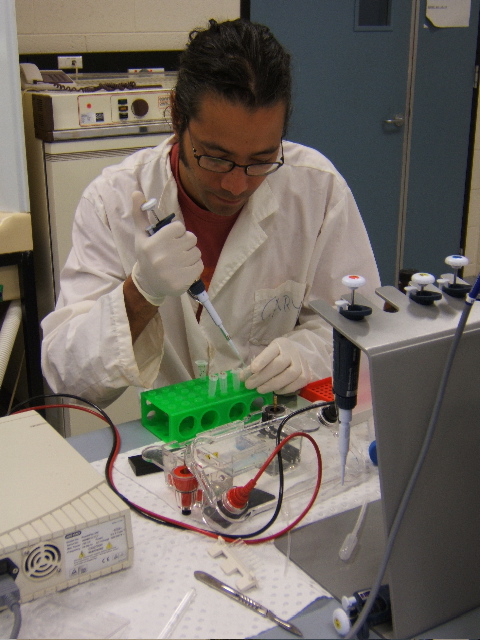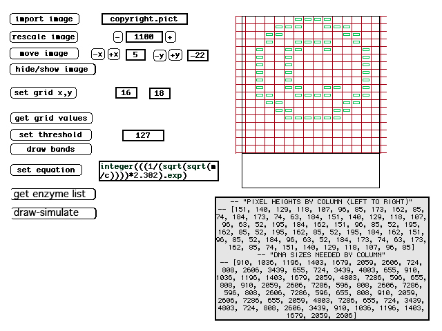 | Planning these images requires knowing what size DNA is required to move at the correct speed in each column of the image. DNA moves through the gelatin at a rate inversely proportional to its size (and moves from the negatively charged end of the gel to the positively charged end of the gel). To determine the proper band-size, a custom simulation programs was written. The LFP simulator first determines what ideal sizes DNA should be to produce the proper bands. This is made possible because many organisms have stable regions of DNA with little variance. Then it exhaustively catalogues the cut points on the DNA that would be made by each possible enzyme and simulates varied possible combinations of these enzymes. The program tries thousands of combinations for each lane of the image and ranks each combination according to each band's deviation from the ideal. Once the best combination is discovered, the program outputs the best combination of enzymes to achieve this. (See figure 1 on "intro" page, showing actual enzymes used for each lane). |
