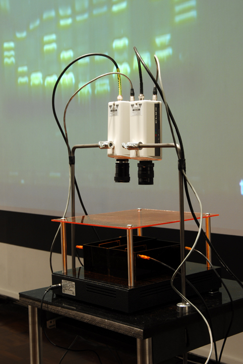 | The imaging process (gel electrophoresis) is captured live by video cameras attached to the installation worktable. This is achieved through a novel combination of non-hazzardous DNA stain, blue light LEDs and tinted acrylic filters that allow the DNA’s movements to be visible to the naked eye without eye protection, whereas typically in lab-work, the imaging process occurs only at the end of electrophoresis and often requires UV light protection. |
