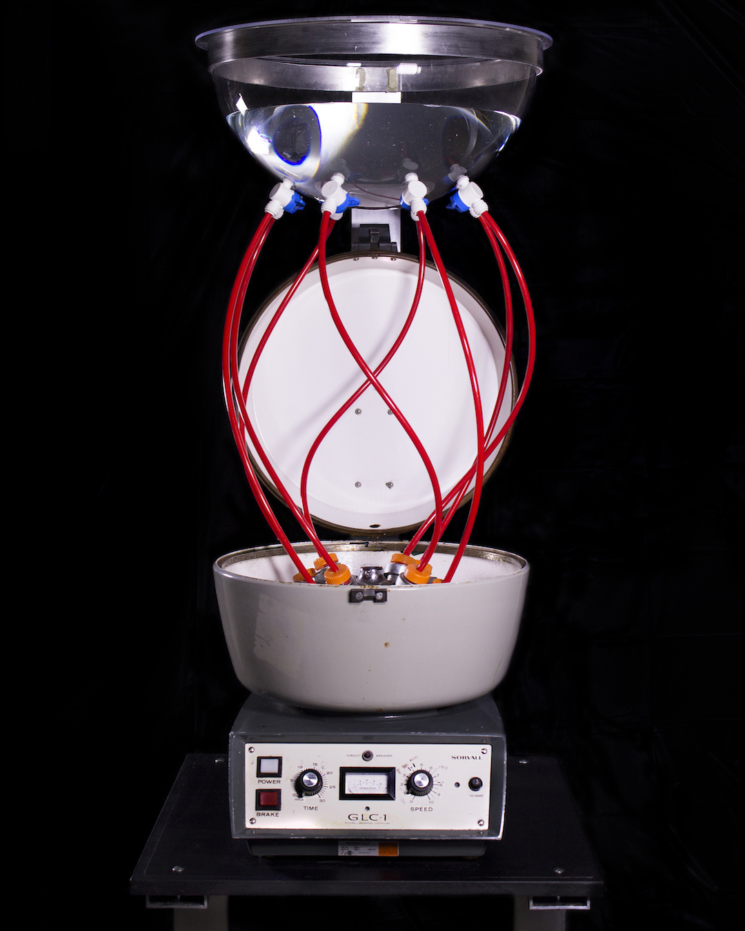 Gallery, Philadelphia, on October 20, 2016, and received an Award of Distinction at Prix Ars Electronica, Linz, in 2017. Visitors to the installation first encountered what might resemble a human-scale fountain or decanter, which was actually a spittoon in which their donated spit was collected. Entering the exhibition, viewers were offered a one ounce cup of saline solution and asked to swish for thirty seconds, then to deposit the solution into the spittoon. During the installation I extracted the DNA from what I hoped to be hundreds of spit samples—containing cheek cells and the cells’ DNA—all mixed together. The DNA was not individuated nor retained: it was processed as a whole to make iconic DNA Fingerprint images of power—such as a crown, warplanes and a flag—which were visible as video projections of the electrophoresis gels throughout the exhibition. |